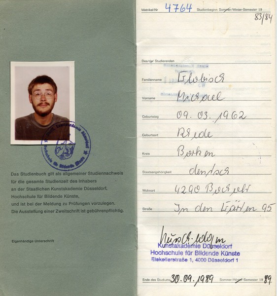 Zum nächsten Wintersemester im Jahr 1983 brachte ich dann auch meine mittlerweile prall gefüllte Mappe in die Akademie und hatte mich damit ganz offiziell um ein Kunststudium beworben. Noch im Juni desselben Jahres bekam ich die Zusage zu diesem Studium. Meine Mappe wurde von der Prüfungskommission mit der Note 3,0 bewertet, was mich doch schon ein bisschen geärgert hat, war ich es doch gewohnt, bisher nur Zweien und Einsen für meine Arbeit bekommen zu haben. Dass die Note 3,0 für eine Bewerbung an der Kunstakademie Düsseldorf aber schon eine sehr gute Bewertung war, erfuhr ich erst später. Ende September 1989 begann dann mein Studium. Vorher hatte ich mir in Düsseldorf eine kleine karge Wohnung gemietet, in der ich auch künstlerisch arbeiten konnte. Die ersten Tage in der Akademie waren jedoch sehr gewöhnungsbedürftig für mich. Mit mir sind in diesem Semester noch ca. 80 weitere Studenten aufgenommen worden, die alle im Orientierungsbereich der Akademie arbeiteten. Dort, im Orientierungsbereich mussten alle Studienanfänger die ersten beiden Semester an der Akademie fristen, bevor sie sich in verschiedenste Meisterklassen bewerben konnten. Ich nutzte diese Orientierungsphase dazu, mich in ganz anderen Bereichen der bildenden Kunst zu erproben. So begann ich dann damit, bildhauerisch tätig zu werden, was ich vorher noch nie gemacht hatte. Das war eine sehr spannende Arbeit, die ich während der ersten beiden Semester unter Anleitung des damaligen Dozenten und späteren Rektors der Akademie Tony Cragg, bewerkstelligte. Ich übte mich im Umgang mit Gips, Metall und auch mit Holz, dabei entstanden einige sehr interessante Arbeiten. Nach den beiden Orientierungssemestern entschloss ich mich dazu, noch ein weiteres Semester im Orientierungsbereich zu verbringen, wusste ich bis dahin doch nicht, in welche Meisterklasse ich weiter studieren wollte. Mittlerweile war ich aus privaten Gründen wieder von Düsseldorf zurück nach Bocholt gezogen. Hier hatte ich das Glück, ein sehr gutes Atelier in Rhede/Krommert auf einem alten Bauernhof zu finden. Ich arbeitete weiterhin fast ausschließlich nur bildhauerisch, dann und wann entstanden ein paar Bilder, denen ich jedoch kaum Beachtung schenkte. Nach diesem 3. Semester in der Düsseldorfer Kunstakademie, fand ich dann auch den für mich geeigneten Professor: David Rabinowitch, ein Kanadier, der noch nicht lange in der Kunstakademie tätig war und dauernd zwischen seinem Atelier in New York und der Akademie in Düsseldorf hin und her pendelte. Er war ganz begeistert von meinem Atelier in der Abgeschiedenheit der Münsterländischen Landschaft. Er bestärkte mich darin, dort weiter bildhauerisch zu arbeiten. In dieser Zeit entstanden eine Vielzahl plastischer Arbeiten, die zum größten Teil aber noch sehr an die Arbeit meines Professors erinnerten. Erst spät konnte ich mich seinem Einfluss entziehen. Doch begann ich nun damit, mich mit einem Mitstudenten künstlerisch auseinander zu setzen, was meiner Arbeit sehr von Vorteil gereichte. 1986 hatte ich dann auch zusammen mit meinem Mitstudenten Klemens Hechenrieder eine erste Ausstellung im Bocholter Rathaus, die für uns beide sehr erfolgreich verlief. Bis hin zu meinem Studienende folgten noch weitere Gruppen- und Einzelausstellungen, meist im Einzugsbereich Bocholts und Umgebung, aber auch in den Niederlanden konnte ich meine Arbeiten präsentieren.